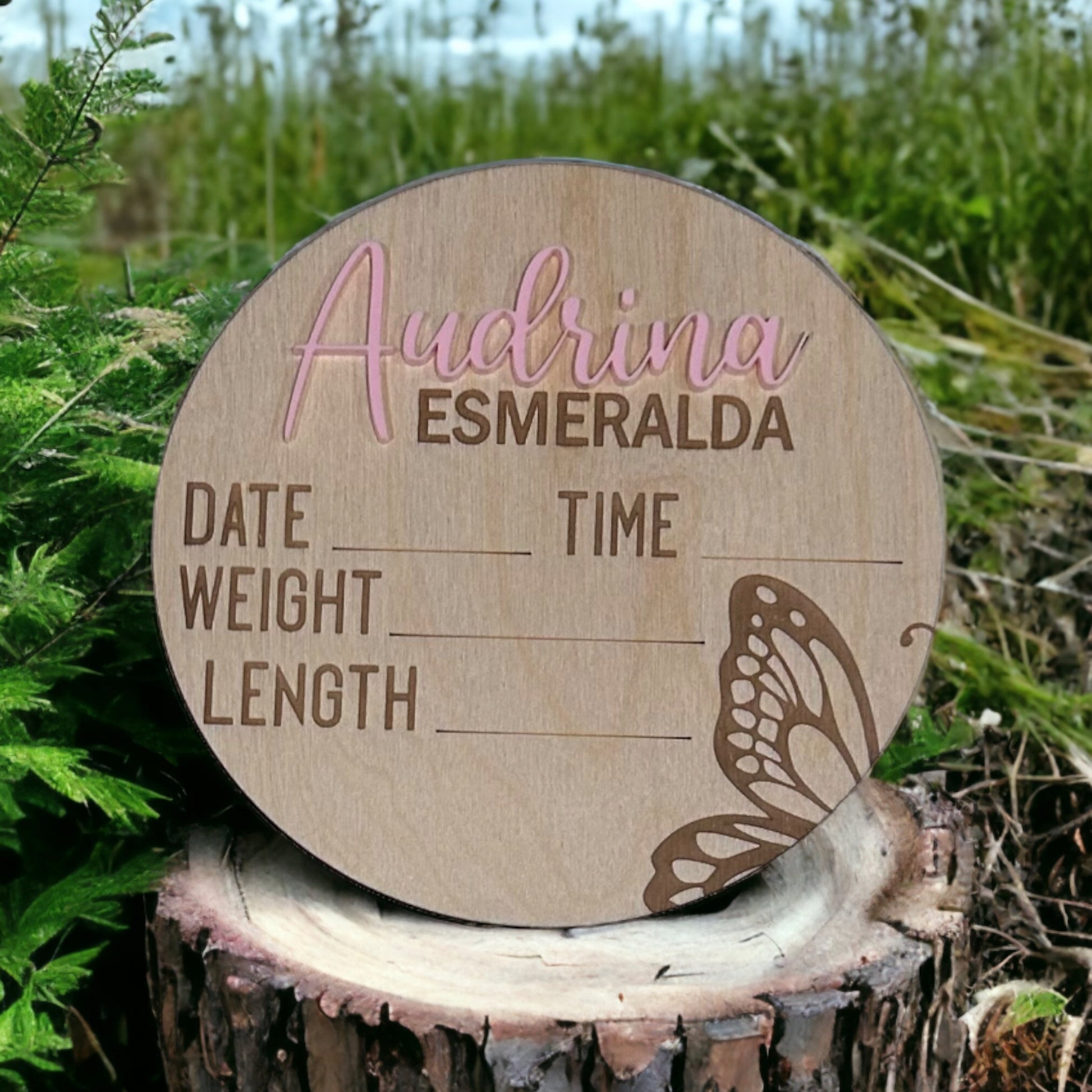 The wood circle is 6 inches in diameter. Each piece has an acrylic 3-D precision cut first name and an engraved middle name. The date, weight, and length details are left blank to be filled in once your little bundle of joy arrives. This beautiful announcement fits well in a hospital bag and has matching milestones.