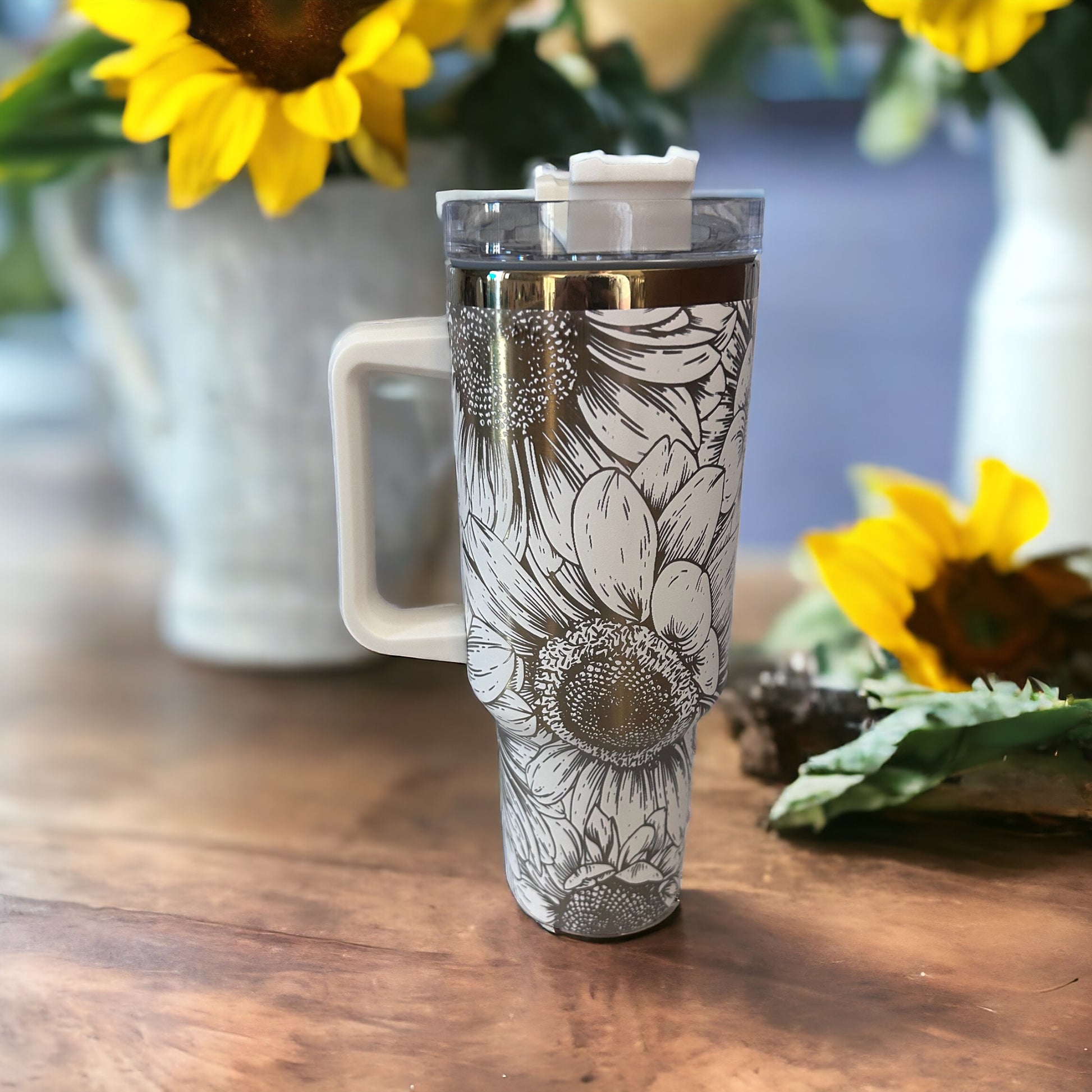 40 oz. Engraved Sunflower Tumbler with Handle & Straw – Double Wall Insulated