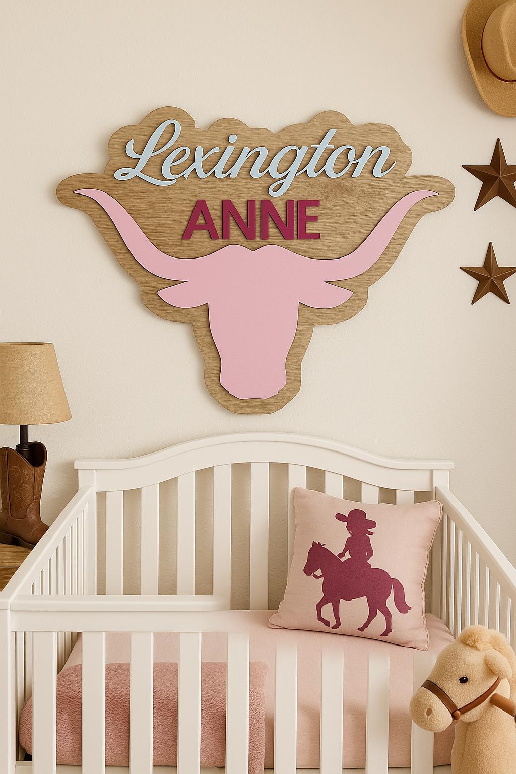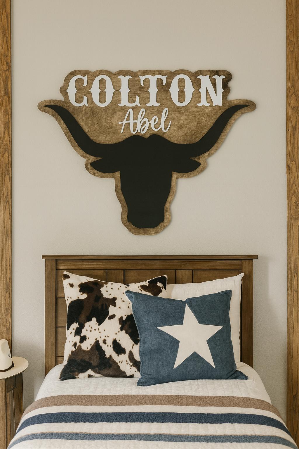 Customize with child’s first and middle name for a one-of-a kind statement piece that’s both rugged and heartfelt. Also indicate what color you would like Longhorn to be e.g., silver, black etc.. Whether hung over a crib, bed or dresser, this sign adds a personalized western touch to any room.